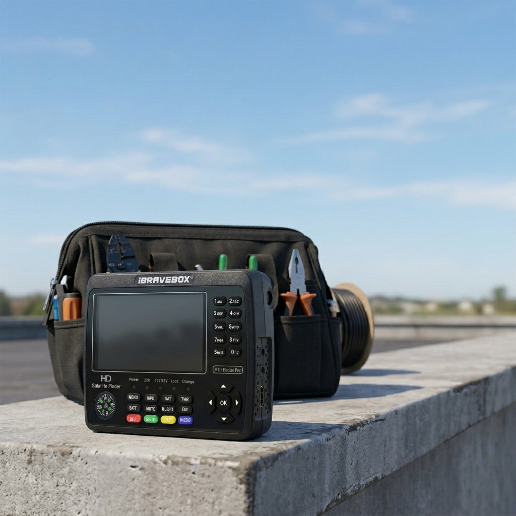 این محصول یک فایندر تصویری ( Finder) از برند iBRAVEBOX مدل V10 Finder Max است. این دستگاه ابزاری حرفهای برای نصابان آنتن دیجیتال صدا سیما روی پخش داخلی و خارجی جهت تنظیم دقیق و سیگنالیابی است.